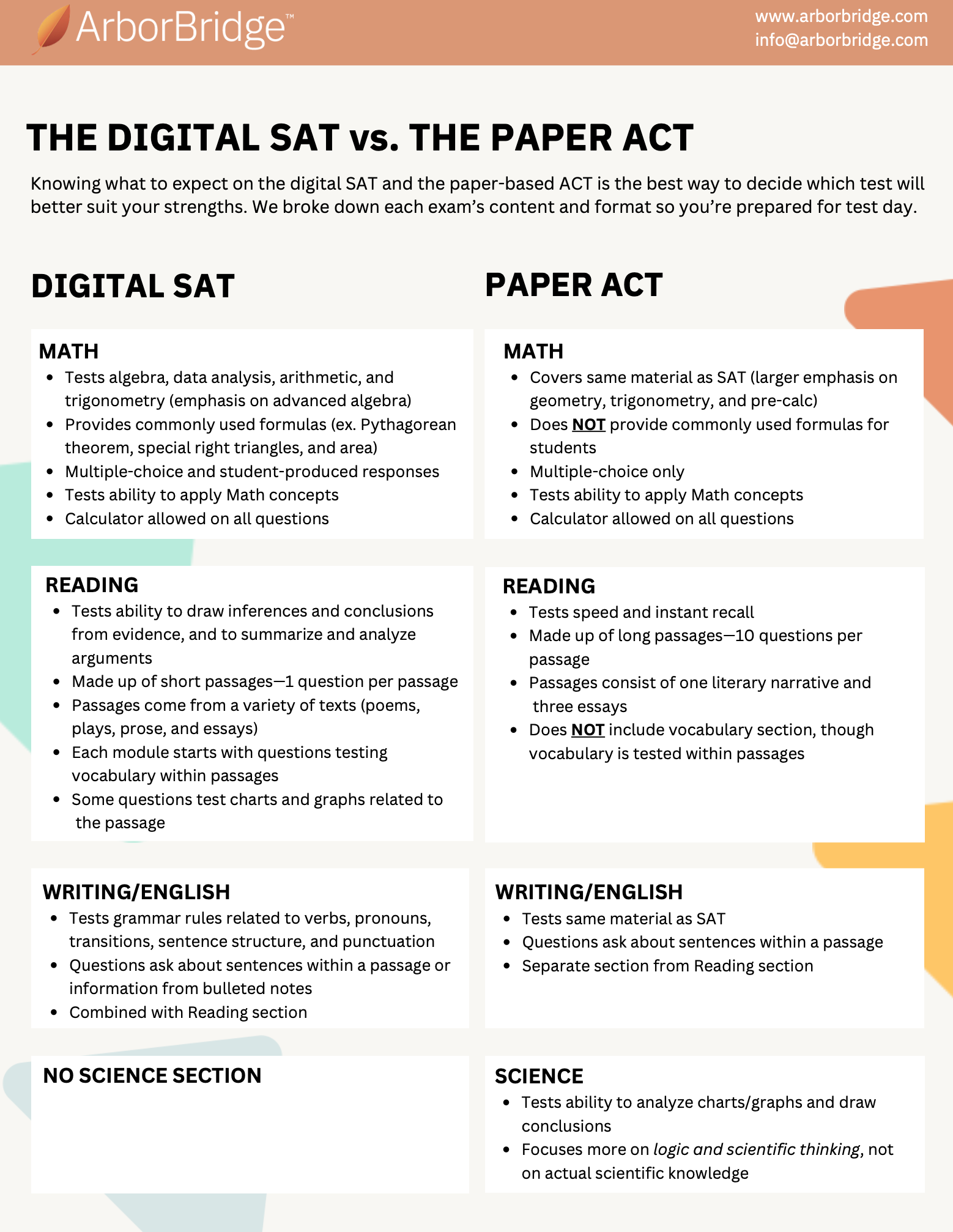 Content Focus: The SAT emphasizes reasoning and problem-solving, while the ACT includes a broader content range, including a science section.